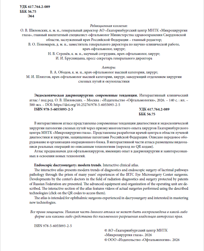 В интерактивном атласе представлены современные тенденции диагностики и эндоскопической хирургии патологии слезных путей через призму многолетнего опыта хирургов Екатеринбургского центра МНТК «Микрохирургия глаза». Представлены разработки врачей центра в области лучевой диагностики и хирургии, защищенные патентами Российской Федерации. Описано передовое обо- рудование и организация операционного блока. В интерактивной части атласа размещены видеоза- писи реальных операций по описанным технологиям (переход по QR-кодам).