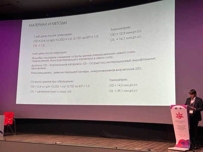 Заведующий операционным блоком клиники «Микрохирургия глаза. Клиника им. Святослава Федорова», к.м.н., врач-офтальмолог, Миронов А.В..jpgНе менее интересный доклад представил заведующий операционным блоком клиники «Микрохирургия глаза. Клиника им. Святослава Федорова», к.м.н., врач-офтальмолог, Миронов А.В. (Москва). На примере разбора клинического случая он продемонстрировал эффективность ранней витрэктомии при послеоперационном эндофтальмите, подчеркнув необходимость следования доказанным стандартам на всех этапах лечения.