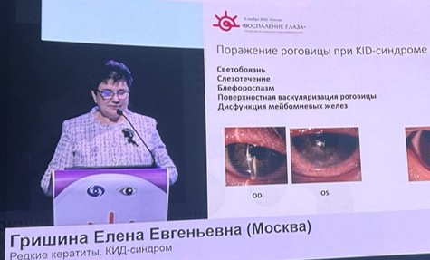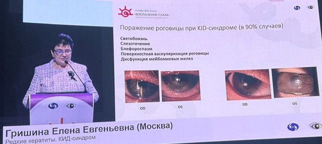 Главный научный сотрудник онкологического отделения хирургических методов лечения, д.м.н., профессор кафедры офтальмологии и оптометрии ГБУЗ МО МОНИКИ им. М. Ф. Владимирского, Гришина Е.Е..jpgВ рамках секции «Офтальмопатия и кератиты. Часть 1» с содержательной лекцией выступила главный научный сотрудник онкологического отделения хирургических методов лечения, д.м.н., профессор кафедры офтальмологии и оптометрии ГБУЗ МО МОНИКИ им. М. Ф. Владимирского, Гришина Е.Е. Ее работа была посвящена редким кератитам, ассоциированным с KID-синдромом — крайне редким генетическим заболеванием (частота встречаемости 1:1000000), характеризующимся триадой симптомов: поражение роговицы, кожи и внутреннего уха. Было отмечено, что радикального лечения патологии не существует, а офтальмологическая помощь носит паллиативный характер и заключается в системной терапии с последующей послойной кератопластикой.