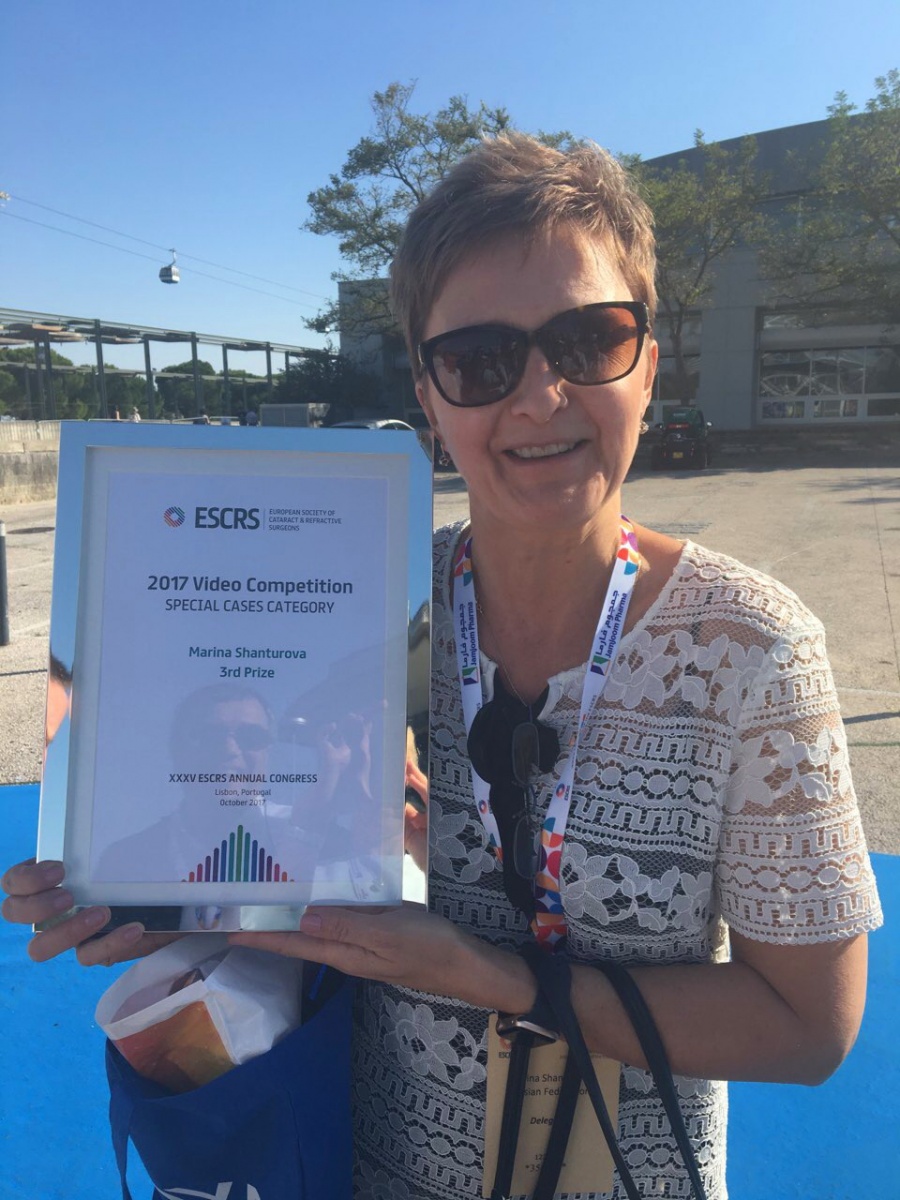 Еще один повод для гордости у российской делегации появился, когда на видеосекции, проходившей в рамках ESCRS, врач-офтальмолог из Иркутского филиала МНТК «Микрохирургия глаза» Марина Шантурова получила приз. Её фильм, рассказывающий о клиническом случае повторной кератопластики после отторжения донорского материала, занял III место.